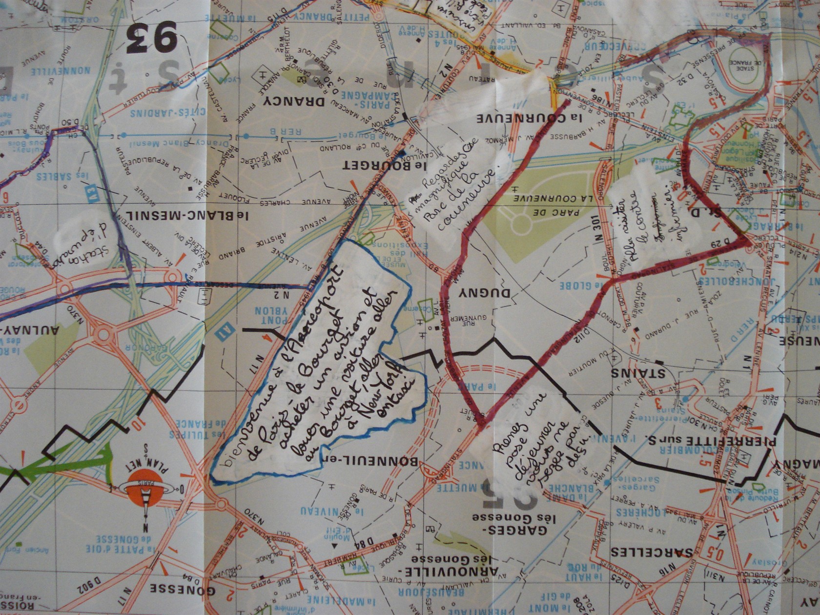 L’atelier « L’usage d’un chemin » a été conçu à l’occasion de la Biennale Art Grandeur Nature 2008 (Conseil général de la Seine-Saint-Denis et centre d’art Synesthésie). Il avait lieu au Musée d’art et d’histoire de Saint-Denis et il était destiné à des élèves de la maternelle au post-bac. “L’atelier immerge les élèves dans l’univers et le cheminement intellectuel de l’artiste. À partir du modèle graphique et stylistique des guides de voyage touristique et de randonnée pédestre, les élèves sont invités à choisir et tracer, à partir d’une carte IGN, un trajet qui leur est familier. Il s’agit ensuite d’imaginer ce qu’ils souhaitent en retenir et ce sur quoi, ils aimeraient attirer l’attention d’un futur promeneur guidé par leurs choix.”